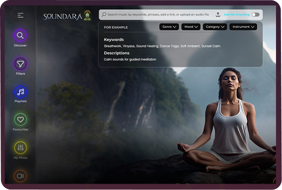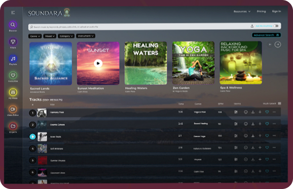 Find the perfect track instantly with a wellness specific search system designed around mood, energy, intention, movement style, and class format.