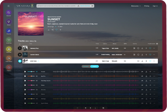 Find the perfect track instantly with a wellness specific search system designed around mood, energy, intention, movement style, and class format.