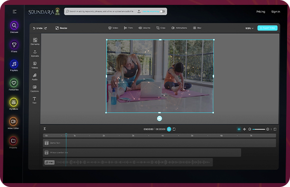 All the basics you need to upload your video clips and add your customized music mixes - trim, cut, sync, add audio voiceovers, captions, effects, and export ready-to-share content.